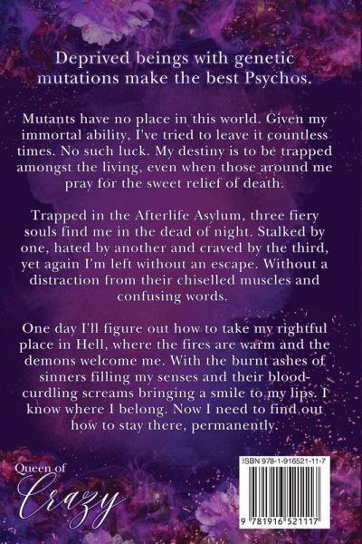 Deprived beings with genetic mutations make the best Psychos. Mutants have no place in this world. Given my immortal ability, I've tried to leave it countless times. No such luck. My destiny is to be trapped amongst the living, even when those around me pray for the sweet relief of death. Trapped in the Afterlife Asylum, three fiery souls find me in the dead of night. Stalked by one, hated by another and craved by the third, yet again I'm left without an escape. Without a distraction from their chiselled muscles and confusing words. One day I'll figure out how to take my rightful place in Hell, where the fires are warm and the demons welcome me. With the burnt ashes of sinners filling my senses and their blood-curdling screams bringing a smile to my lips. I know where I belong. Now I need to find out how to stay there, permanently.