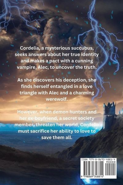 Cordelia, a mysterious succubus, seeks answers about her true identity and makes a pact with a cunning vampire, Alec, to uncover the truth. As she discovers his deception, she finds herself entangled in a love triangle with Alec and a charming werewolf. However, when demon hunters and her ex-boyfriend, a secret society member, threaten her world, Cordelia must sacrifice her ability to love to save them all.