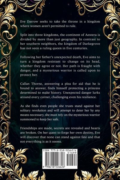 Eve Darrow seeks to take the throne in a kingdom where women aren't permitted to rule. Split into three kingdoms, the continent of Aestera is divided by more than just geography. In contrast to her southern neighbors, the kingdom of Darkegrove has not seen a ruling queen in five centuries. Following her father's unexpected death, Eve aims to turn a kingdom resistant to change on its head, whether they agree or not. Her path is fraught with danger, and a mysterious warrior is called upon to protect her. Callan Thorne, answering a plea for aid that he is bound to answer, finds himself protecting a princess determined to make history. Unexpected danger lurks around every corner, challenging even his resilience. As she finds even people she trusts stand against her solitary revolution and will attempt to deter her by any means necessary, she must rely on the mysterious warrior summoned to keep her safe. Friendships are made, secrets are revealed and hearts are broken. On her quest to forge her own destiny, Eve will discover that none can stand against fate and that not everything is as it seems.