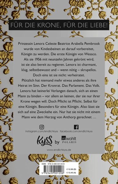 Prinzessin Lenora Celeste Beatrice Arabella Pembrook wurde von Kindesbeinen an darauf vorbereitet, Königin zu werden. Die erste Königin von Wessco. Als sie 1956 mit neunzehn Jahren gekrönt wird, ist sie also bereit, zu regieren. Lenora ist charmant, klug, selbstbewusst und - wenn nötig - skrupellos. Doch eins ist sie nicht: verheiratet.