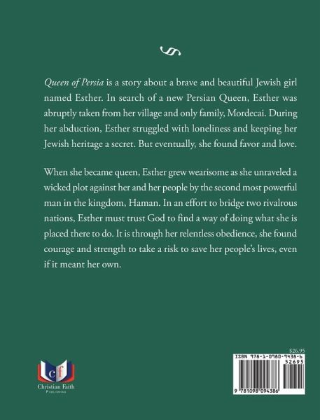 Queen of Persia is a story about a brave and beautiful Jewish girl named Esther. In search of a new Persian Queen, Esther was abruptly taken from her village and only family, Mordecai. During her abduction, Esther struggled with loneliness and keeping her Jewish heritage a secret. But eventually, she found favor and love. When she became queen, Esther grew wearisome as she unraveled a wicked plot against her and her people by the second most powerful man in the kingdom, Haman. In an effort to bridge two rivalrous nations, Esther must trust God to find a way of doing what she is placed there to do. It is through her relentless obedience, she found courage and strength to take a risk to save her people's lives, even if it meant her own.