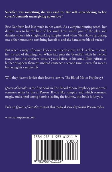 Sacrifice was something she was used to. But will surrendering to her coven's demands mean giving up on love? Brie Danforth had lost much in her youth. As a vampire-hunting witch, her destiny was to be the best of her kind. Love wasn't part of the plan and definitely not with a high-ranking vampire. And when Nick shows up during one of her hunts, she can't bring herself to end the handsome blood-sucker. But when a surge of power knocks her unconscious, Nick is there to catch her instead of draining her. When fate puts the beautiful witch he helped escape from his brother's torture years before in his arms, Nick refuses to let her disappear from his undead existence a second time… even if it means betraying his vampire life. Will they have to forfeit their love to survive The Blood Moon Prophecy? Queen of Sacrifice is the first book in The Blood Moon Prophecy paranormal romance series by Susan Person. If you like vampire and which romance, magic, and a head strong heroine leading the journey, this book is for you. Pick up Queen of Sacrifice to start this magical series by Susan Person today.