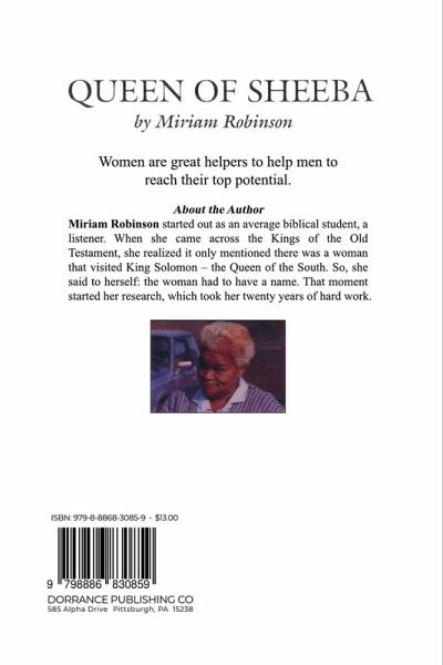 About the Book Women are great helpers to help men to reach their top potential. About the Author Miriam Robinson started out as an average biblical student, a listener. When she came across the Kings of the Old Testament, she realized it only mentioned there was a woman that visited King Solomon - the Queen of the South. So, she said to herself: the woman had to have a name. That moment started her research, which took her twenty years of hard work.