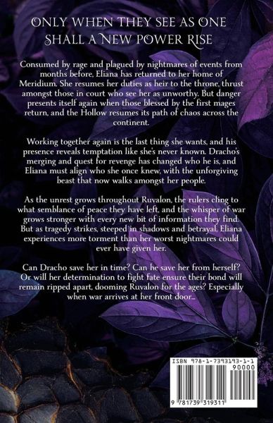 The fates have spoken. The attacks of the Hollow have ceased, and Eliana has returned to her home in Meridium. Betrayal has filled her heart with rage after what happened in Tenebris, and she vows to fulfil her promise should Dracho ever return. The new emperor. She resumes her duties as heir to the throne, thrust amongst those in court who see her as unworthy. But danger presents itself again when those blessed by the first mages return, and the Hollow resumes its path of chaos across the continent. Working together again is the last thing she wants and his presence reveals temptation like she's never known. His merging and quest for revenge have changed who he is, and Eliana must align who she once knew with the unforgiving beast that now walks amongst her people. Dark secrets that have been at play for many years will come to light, changing the course of history for all. As the unrest grows throughout Ruvalon, the rulers cling to what semblance of peace they have left, and the whisper of war grows stronger with every new bit of information they find. But as tragedy strikes, steeped in shadows and betrayal, Eliana experiences more torment than her worst nightmares could ever have given her. Can Dracho save her in time? Can he save her from herself? Or will her determination to fight fate ensure their bond will remain ripped apart, dooming Ruvalon for the ages? Only when they can see as one, shall a shift in power rise.