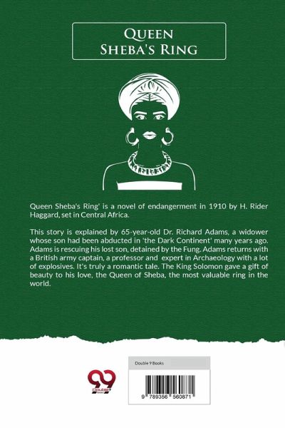 'Queen Sheba's Ring' is a novel of endangerment in 1910 by H. Rider Haggard, set in Central Africa. This story is explained by 65-year-old Dr. Richard Adams, a widower whose son had been abducted in 'the Dark Continent' many years ago. Adams is rescuing his lost son, detained by the Fung. Adams returns with a British army captain, a professor and expert in Archaeology with a lot of explosives. It's truly a romantic tale. The King Solomon gave a gift of beauty to his love, the Queen of Sheba, the most valuable ring in the world.