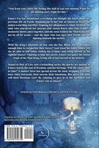 "You lived your entire life feeling like half of you was missing. Fight for the missing part. Fight for this." Emory Fae has abandoned everything she thought she knew about her previous life on Earth. Stepping up to her role as Queen of Kiero she makes a startling sacrifice- feigning her allegiances to Adair Stratton, the man who murdered her parents and casted Kiero into ruin. Emory’s memories slowly piece together, and she soon realizes the Mad King may not be all he seems— and the man who was once best friend, may be fighting beneath the surface. With the King’s attention on her, can she buy Black Dawn Rebellion enough time to recuperate their forces? And when the times comes, will she be able to kill Adair, ending his tyranny and rising herself as the rightful Queen? Fighting to hide her secret, Emory navigates the brutal trials of the Mad King, trying not to lose herself in the process. Sequel to Heir of Lies, now a bestselling series, the sparks are ignited, as Emory learns the cost of freedom, and her heritage. Will the rebels unite in time? A sinister force has spread across the land, stripping everyone bare- their betrayals, their secrets, their intentions. But above all, what will their decisions cost? By refusing to give in to the darkness, will Emory rise as Queen?