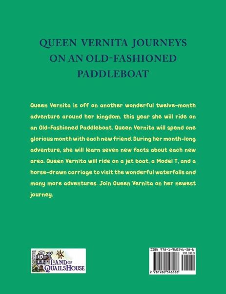 Queen Vernita is off on another wonderful twelve-month adventure around her kingdom. this year she will ride on an Old-Fashioned Paddleboat. Queen Vernita will spend one glorious month with each new friend. During her month-long adventure, she will learn seven new facts about each new area. Queen Vernita will ride on a jet boat, a Model T, and a horse-drawn carriage to visit the wonderful waterfalls and many more adventures. Join Queen Vernita on her newest journey.