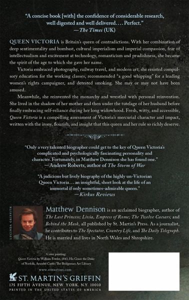 Queen Victoria is Britain's queen of contradictions. In her combination of deep sentimentality and bombast; cultural imperialism and imperial compassion; fear of intellectualism and excitement at technology; romanticism and prudishness, she became a spirit of the age to which she gave her name. Victoria embraced photography, railway travel and modern art; she resisted compulsory education for the working classes, recommended for a leading women's rights campaigner 'a good whipping' and detested smoking. She may or may not have been amused. Meanwhile she reinvented the monarchy and wrestled with personal reinvention. She lived in the shadow of her mother and then under the tutelage of her husband; finally she embraced self-reliance during her long widowhood. Fresh, witty and accessible, Matthew Dennison's Queen Victoria is a compelling assessment of Victoria's mercurial character and impact, written with the irony, flourish and insight that this Queen and her rule so richly deserve.
