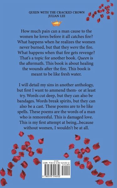 Queen with the Cracked Crown is a solo anthology inspired by different women in the author's life. Each poem details the author's unique appreciation for each woman. The relationships the author has with each woman range from platonic to familial to romantic in nature. In case he hasn't expressed his appreciation enough for them verbally, here it is beautifully immortalized in ink. I often under-appreciate women. Men generally reduce women to their physical appeal and I admit that I have too. Many women are scarred and tormented by this reality. When so much emphasis is placed on how you look, of course you'll often feel insecure. This anthology is for women who obsess over these insecurities; for women who tie their social identities directly to their appearance. These are poems to help you reassess your value and redesign your idea of a woman's beauty.