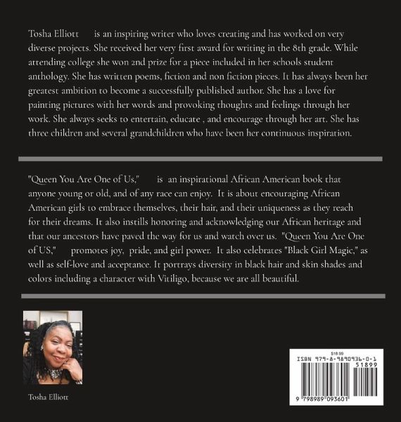 This is an inspirational African American book that anyone young or old, and of any race can enjoy. It is about encouraging African American girls to embrace themselves, their hair, and their uniqueness as they reach for their dreams. It also instills honoring and acknowledging our African heritage and that our ancestors have paved the way for us and watch over us. Promotes joy, pride, and girl power. It also celebrates Black Girl Magic, as well as self-love and acceptance. It portrays diversity in black hair and skin shades and colors including a character with Vitiligo, because we are all beautiful.