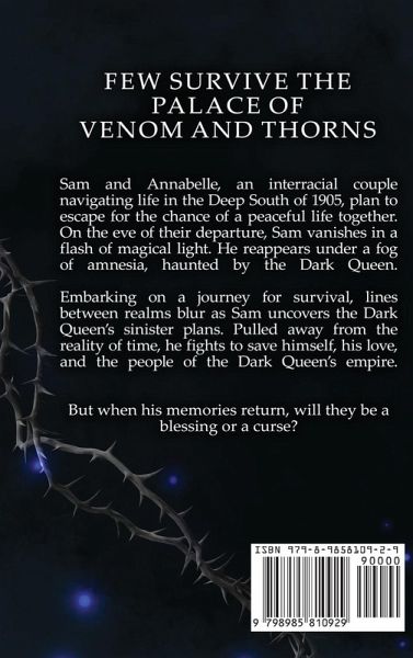 FEW SURVIVE THE PALACE OF VENOM AND THORNS Sam and Annabelle, an interracial couple navigating life in the Deep South of 1905, plan to escape for the chance of a peaceful life together. On the eve of their departure, Sam vanishes in a flash of magical light. He reappears under a fog of amnesia, haunted by the Dark Queen. Embarking on a journey for survival, lines between realms blur as Sam uncovers the Dark Queen's sinister plans. Pulled away from the reality of time, he fights to save himself, his love, and the people of the Dark Queen's empire. But when his memories return, will they be a blessing or a curse?