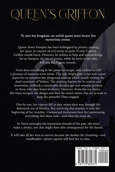To save her kingdom, an exiled queen must locate five mysterious stones. Queen Avera Voxspira has been kidnapped by pirates, putting her quest to counter an evil entity in peril. If only Captain Griffon would listen. However, he refuses to help and instead brings her to Saarpira, the isle of pirates, while he waits to see who will pay the biggest ransom. Avera does everything in her power to escape, only to find herself a prisoner of someone even worse. The only bright spot is her new captor wants her to complete her dangerous mission which entails visiting the dead continent of Verlora. The country, known for its science and innovation, suffered a catastrophe decades ago and remains perilous to--- those who dare brave its shores. However, Avera has no choice. She must navigate the danger and find the stolen stones that act as seals to keep the powerful Zhos trapped. One by one, her captors fall as they weave their way through the destroyed city of Sitnalta. But surviving that journey is only the beginning of her troubles. Unexpected revelations have her questioning everything she's been told-and what she must do. As Avera untangles the mysterious threads of the past, she must make a choice, one that might have dire consequences for the future. It will take all her wits to survive because she doubts the charming-and insufferable-pirate captain will find her in time.