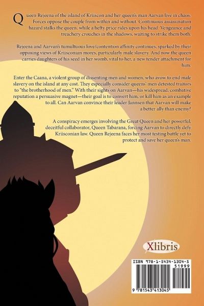 Queen Rejeena of the island of Kriiscon and her queen's man Aarvan live in chaos. Forces oppose the couple from within and without. Continuous assassination hazard stalks the queen while a hefty price rides upon his head. Vengeance and treachery crouch in the shadows, waiting to strike them both. Rejeena and Aarvan's tumultuous love / contentious affinity continues, sparked by their opposing views of Kriisconian mores, particularly male slavery. And now the queen carries daughters of his seed in her womb that is vital to her-a new tender attachment for him. Entering Caana, they meet a violent group of dissenting men and women who avow to end male slavery on the island at any cost. They, especially, consider the queen's man a detested traitor to the brotherhood of men. Their sight was on Aarvan, who showed that his widespread, combative reputation was a persuasive magnet. Their goal is to convert him or kill him as an example to all. Can Aarvan convince their leader Jannsen that he will make a better ally than enemy? A conspiracy emerges involving the great queen and her powerful, deceitful collaborator Queen Tabarana forcing Aarvan to directly defy Kriisconian law. Queen Rejeena faces her most testing battle yet to protect and save her queen's man.