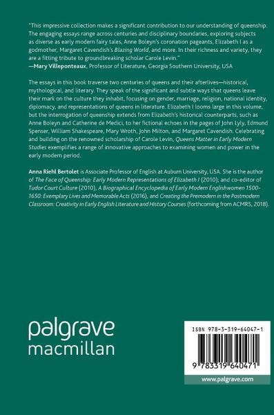 1. Introduction: Studies of Queens in Honor of Carole Levin.- I. Prelude: Studying Queens.- 2. Queenship and Power: The Heart and Stomach of a Book Series.- II. Queens and Matters of Gender.- 3. Did Elizabeth's Gender Really Matter?.- 4. A Great Reckoning in a Little Room: Elizabeth, Essex, and Royal Interruptions.- 5. "We are such stuff": Absolute Feminine Power vs. Cinematic Myth-Making in Julie Taymor's Tempest (2010).- III. Queens and Marriage.- 6. Elizabeth I and the Marriage Crisis, John Lyly's Campaspe, and the Politics of Court Drama.- 7. Tudor Consorts: The Politics of Royal Matchmaking, 1483-1543.- 8. The Queen's Deathbed Wish in Early Modern Fairy Tales: Securing the Dynasty.- IV. Queens and Religion.- 9. Spenser's Dragon Fight and the English Queen: The Struggle over the Elizabethan Settlement.- 10. Anne Boleyn's Legacy to Elizabeth I: Neoclassicism and the Iconography of Protestant Queenship.- 11. "A Network of Honor and Obligation": Elizabeth as Godmother.-V. Queens, National Identity, and Diplomacy.- 12. Lesbianism in Early Modern Vernacular Romance: The Question of Historicity.- 13. Doppelgänger Queens: Elizabeth Tudor and Mary Stuart.- 14. Elizabeth I and the Politics of Invoking Russia in Shakespeare's Love's Labour's Lost.- 15. Queen Elizabeth I and Elizabethan Court in the French Ambassador's Eyes.- VI. Inspired by the Queen: Queens in Literature.- 16. Queen of Love-Elizabeth Tudor and Mary Wroth.- 17. Dressing Queens (and Some Others): Signifying through Clothing in Wroth's Countess of Montgomery's Urania.- 18. Conjuring Three Queens and an Empress: The Philosophy of Enchantment in Margaret Cavendish's Blazing World.