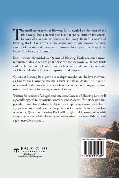 Blowing Rock is a mountainous resort town steeped in history. Discover the monumental accomplishments and objectives of eight incredible women who shaped the destiny of Blowing Rock, North Carolina. The village of Blowing Rock, nestled on the crest of the Blue Ridge, has a storied past made more colorful by the contributions of a unique variety of residents. Dr. Barry Buxton, a native of Blowing Rock, has written a fascinating and deeply moving narrative about eight remarkable women of Blowing Rock's past that shaped the town's future. Each heroine chronicled in Queens of Blowing Rock overcame insurmountable odds to achieve great objectives for the town. With each brick and plank that built schools, churches, hospitals, and libraries, the women left an indelible legacy of compassion and purpose. Queens of Blowing Rock provides in-depth insight into the love the women had for their majestic mountain town and its residents. The "queens" mentioned in the book serve as excellent role models of courage, determination, and honor for young women of today. Written for readers of all ages and interests, Queens of Blowing Rock will especially appeal to historians, women, and students. The author uses impeccable research and scholarly objectivity to spin a true narrative of bravery, perseverance, and desire to help the less fortunate. Beyond a shadow of a doubt, Queens of Blowing Rock will delight and inform readers with every page turned while elevating and celebrating the accomplishments of eight incredible women.