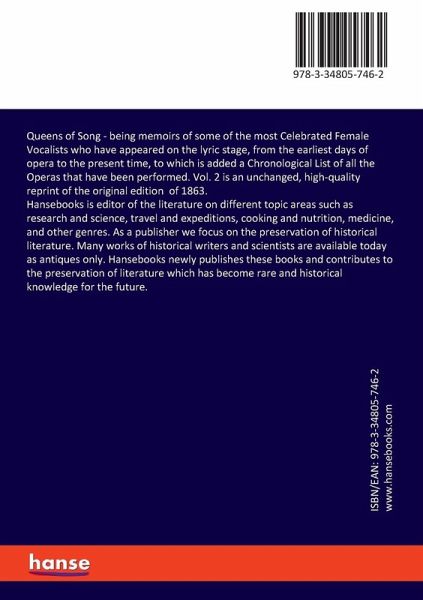 Queens of Song - being memoirs of some of the most Celebrated Female Vocalists who have appeared on the lyric stage, from the earliest days of opera to the present time, to which is added a Chronological List of all the Operas that have been performed. Vol. 2 is an unchanged, high-quality reprint of the original edition of 1863.Hansebooks is editor of the literature on different topic areas such as research and science, travel and expeditions, cooking and nutrition, medicine, and other genres. As a publisher we focus on the preservation of historical literature. Many works of historical writers and scientists are available today as antiques only. Hansebooks newly publishes these books and contributes to the preservation of literature which has become rare and historical knowledge for the future.