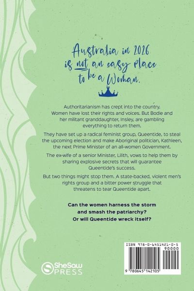 Australia in 2026 is not an easy place to be a woman. Authoritarianism has crept into the country. Women have lost their rights and voices. But Bodie and her militant granddaughter, Insley, are gambling everything to return them. They have set up a radical feminist group, Queentide, to steal the upcoming election and make Aboriginal politician, Kathleen, the next Prime Minister of an all-women Government. The ex-wife of a senior Minister, Lilith, vows to help them by sharing explosive secrets that will guarantee Queentide's success. But two things might stop them. A state-backed, violent men's rights group and a bitter power struggle that threatens to tear Queentide apart. Can the women harness the storm and smash the patriarchy? Or will Queentide wreck itself?