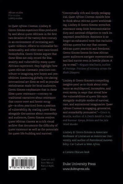In Queer African Cinemas, Lindsey B. Green-Simms examines films produced by and about queer Africans in the first two decades of the twenty-first century in an environment of increasing antiqueer violence, efforts to criminalize homosexuality, and other state-sanctioned homophobia. Green-Simms argues that these films not only record the fear, anxiety, and vulnerability many queer Africans experience; they highlight how queer African cinematic practices contribute to imagining new hopes and possibilities. Examining globally circulating international art films as well as popular melodramas made for local audiences, Green-Simms emphasizes that in these films queer resistance-contrary to traditional narratives about resistance that center overt and heroic struggle-is often practiced from a position of vulnerability. By reading queer films alongside discussions about censorship and audiences, Green-Simms renders queer African cinema as a rich visual archive that documents the difficulty of queer existence as well as the potentials for queer life-building and survival.
