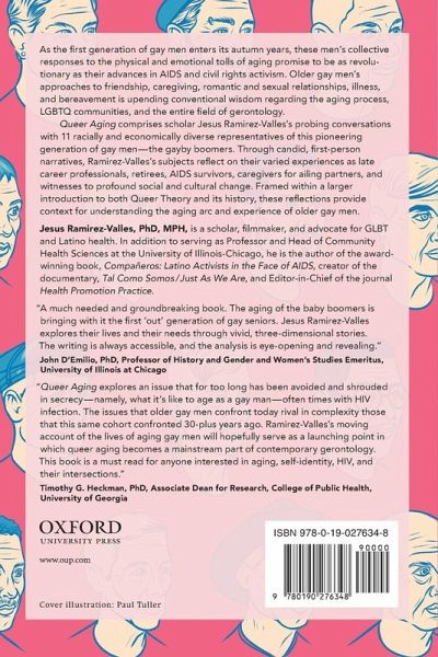 As the first generation of gay men enters its autumn years, these men's responses to the physical and emotional tolls of aging promise to be as revolutionary as their advances in AIDS and civil rights activism. Older gay men's approaches to friendship, caregiving, romantic and sexual relationships, illness, and bereavement is upending conventional wisdom regarding the aging process, LGBTQ communities, and the entire field of gerontology. QUEER AGING comprises scholar Jesus Ramirez-Valles's probing conversations with 11 racially and economically diverse representatives of this pioneering generation of gay men-the gayby boomers. Through candid, first-person narratives, Ramirez-Valles's subjects reflect on their varied experiences as late career professionals, retirees, AIDS survivors, caregivers for ailing partners, and witnesses to profound social and cultural change. Framed within a larger introduction to both Queer Theory and its history, these reflections provide context for understanding the aging arc and experience of older gay men. Spanning sociology, history, cultural studies, and social work, QUEER AGING will be a vital resource for students as well as health professionals who serve the gay community and communities of color.
