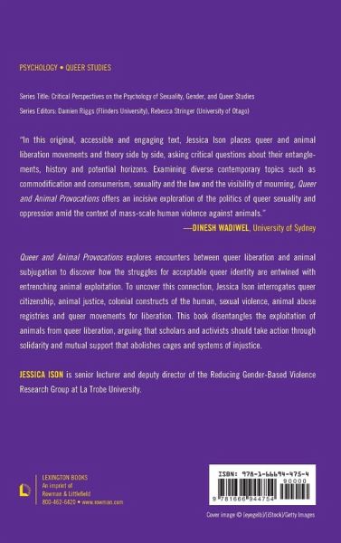 Queer and Animal Provocations explores encounters between queer liberation and animal subjugation to discover how the struggles for acceptable queer identity are entwined with entrenching animal exploitation. To uncover this connection, Jessica Ison interrogates queer citizenship, animal justice, colonial constructs of the human, sexual violence, animal abuse registries and queer movements for liberation. This book disentangles the exploitation of animals from queer liberation, arguing that scholars and activists should take action through solidarity and mutual support that abolishes cages and systems of injustice.