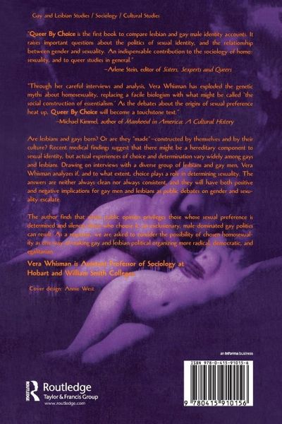 Queer by Choice enters the controversial debate of sexual identity by examining choice in gay men and lesbian sexual identity. Drawing on interviews with a sample of 72 people, Whisman analyzes if, and to what extent, choice played a role in determining identity. Contributing factors such as race, class, religion, and educational level are considered. The results of the study are stimulating and often surprising, and contribute to the escalating debates over sexual identity as lesbians and gays continue to soldier for rights and representation.