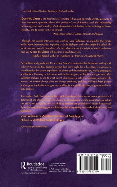 Queer by Choice enters the controversial debate of sexual identity by examining choice in gay men and lesbian sexual identity. Drawing on interviews with a sample of 72 people, Whisman analyzes if, and to what extent, choice played a role in determining identity. Contributing factors such as race, class, religion, and educational level are considered. The results of the study are stimulating and often surprising, and contribute to the escalating debates over sexual identity as lesbians and gays continue to soldier for rights and representation.