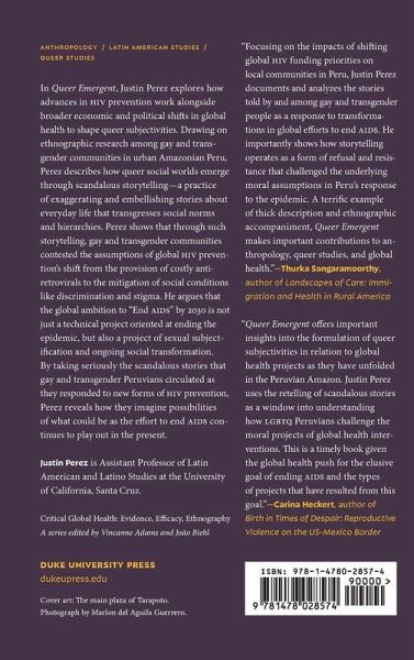 In Queer Emergent, Justin Perez explores how advances in HIV prevention work alongside broader economic and political shifts in global health to shape queer subjectivities. Drawing on ethnographic research among gay and transgender communities in urban Amazonian Peru, Perez describes how queer social worlds emerge through scandalous storytelling-a practice of exaggerating and embellishing stories about everyday life that transgresses social norms and hierarchies. Perez shows that through such storytelling, gay and transgender communities contested the assumptions of global HIV prevention's shift from the provision of costly antiretrovirals to the mitigation of social conditions like discrimination and stigma. He argues that the global ambition to "End AIDS" by 2030 is not just a technical project oriented at ending the epidemic, but also a project of sexual subjectification and ongoing social transformation. By taking seriously the scandalous stories that gay and transgender Peruvians circulated as they responded to new forms of HIV prevention, Perez reveals how they imagine possibilities of what could be as the effort to end AIDS continues to play out in the present.