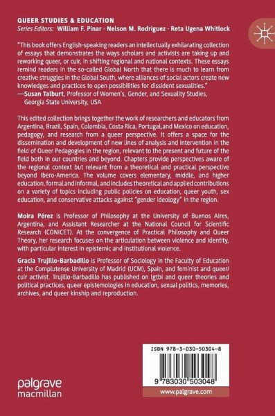 This edited collection brings together the work of researchers and educators from Argentina, Brazil, Spain, Colombia, Costa Rica, Portugal,and Mexico on education, pedagogy, and research from a queer perspective. It offers a space for the dissemination and development of new lines of analysis and intervention in the field of Queer Pedagogies in the region, relevant to the present and future of the field both in our countries and beyond. Chapters provide perspectives aware of the regional context but relevant from a theoretical and practical perspective beyond Ibero-America. The volume covers elementary, middle, and higher education, formal and informal, and includes theoretical and applied contributions on a variety of topics including public policies on education, queer youth, sex education, and conservative attacks against "gender ideology" in the region.