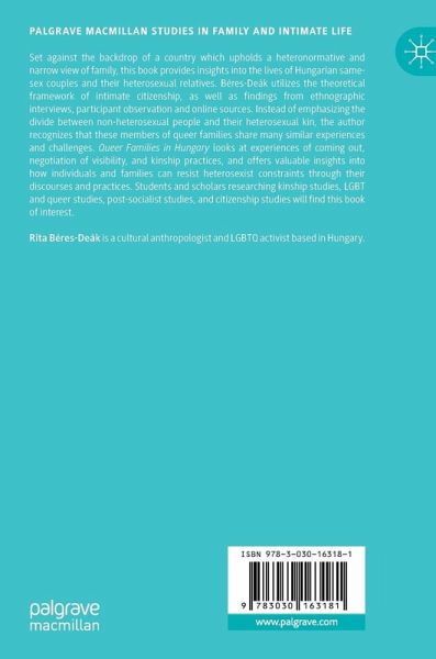 Set against the backdrop of a country which upholds a heteronormative and narrow view of family, this book provides insights into the lives of Hungarian same-sex couples and their heterosexual relatives. Béres-Deák utilizes the theoretical framework of intimate citizenship, as well as findings from ethnographic interviews, participant observation and online sources. Instead of emphasizing the divide between non-heterosexual people and their heterosexual kin, the author recognizes that these members of queer families share many similar experiences and challenges.Queer Families in Hungary looks at experiences of coming out, negotiation of visibility, and kinship practices, and offers valuable insights into how individuals and families can resist heterosexist constraints through their discourses and practices. Students and scholars researching kinship studies, LGBT and queer studies, post-socialist studies, and citizenship studies, will find this book of interest.