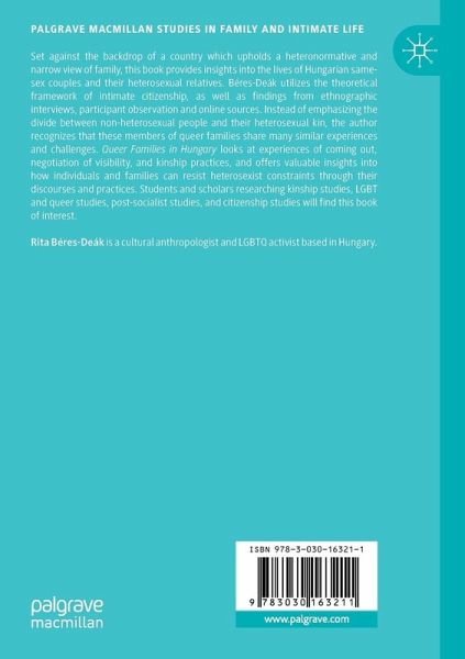 Set against the backdrop of a country which upholds a heteronormative and narrow view of family, this book provides insights into the lives of Hungarian same-sex couples and their heterosexual relatives. Béres-Deák utilizes the theoretical framework of intimate citizenship, as well as findings from ethnographic interviews, participant observation and online sources. Instead of emphasizing the divide between non-heterosexual people and their heterosexual kin, the author recognizes that these members of queer families share many similar experiences and challenges.Queer Families in Hungary looks at experiences of coming out, negotiation of visibility, and kinship practices, and offers valuable insights into how individuals and families can resist heterosexist constraints through their discourses and practices. Students and scholars researching kinship studies, LGBT and queer studies, post-socialist studies, and citizenship studies, will find this book of interest.