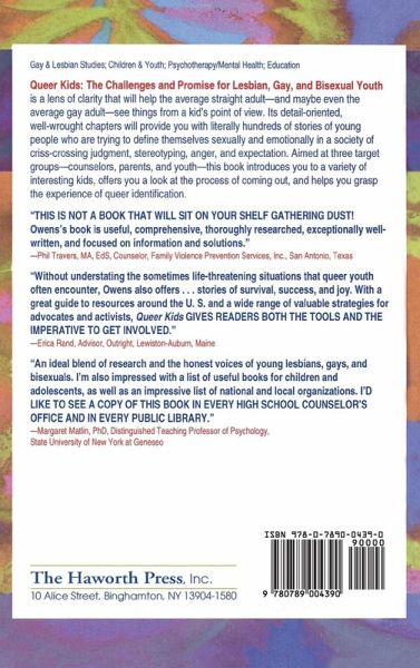 Queer Kids is a lens of clarity that will help the average straight adultand maybe even the average gay adultsee things from a kid's point of view. Its detail-oriented, well-wrought chapters will provide you with literally hundreds of stories of young people who are trying to define themselves sexually and emotionally in a society of criss-crossing judgment, stereotyping, anger, and expectation. Aimed at three target groupscounselors, parents, and youththis book introduces you to a variety of interesting kids, offers you a look at the process of coming out, and helps you grasp the experience of queer identification.