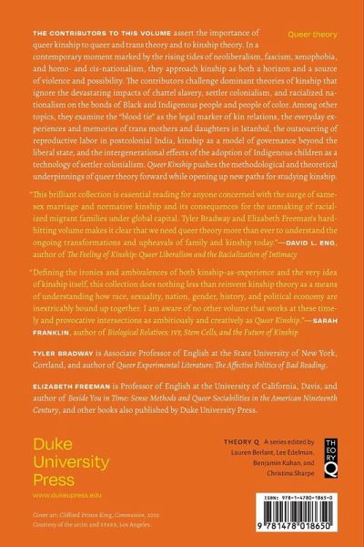 The contributors to this volume assert the importance of queer kinship to queer and trans theory and to kinship theory. In a contemporary moment marked by the rising tides of neoliberalism, fascism, xenophobia, and homo- and cis-nationalism, they approach kinship as both a horizon and a source of violence and possibility. The contributors challenge dominant theories of kinship that ignore the devastating impacts of chattel slavery, settler colonialism, and racialized nationalism on the bonds of Black and Indigenous people and people of color. Among other topics, they examine the "blood tie" as the legal marker of kin relations, the everyday experiences and memories of trans mothers and daughters in Istanbul, the outsourcing of reproductive labor in postcolonial India, kinship as a model of governance beyond the liberal state, and the intergenerational effects of the adoption of Indigenous children as a technology of settler colonialism. Queer Kinship pushes the methodological and theoretical underpinnings of queer theory forward while opening up new paths for studying kinship. Contributors. Aqdas Aftab, Leah Claire Allen, Tyler Bradway, Juliana Demartini Brito, Judith Butler, Dilara Çal¿¿kan, Christopher Chamberlin, Aobo Dong, Brigitte Fielder, Elizabeth Freeman, John S. Garrison, Nat Hurley, Joseph M. Pierce, Mark Rifkin, Poulomi Saha, Kath Weston