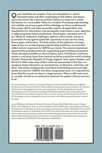 Queer identities are complex. They are embedded in a web of intersectionality and often challenging to fully define. Sometimes queerness shines like a beacon and this radiance is captured in media. Sometimes it is more subtle. Often it is invisible. Promoting understanding and visibility are primary goals of this anthology. As library professionals that create, utilize, and make accessible systems of organization and classification for information, intersectionality must remain a clear objective in addressing these historical absences. These topics represent some of our efforts to respond to challenges, address critical needs, and serve as essential forces against systematic oppression across service areas, library types, and borders. The first section of this collection of essays looks at how we are developing understanding and library services that reflect and are responsive to LGBTQ user needs. The second emphasizes opportunities and approaches for augmenting queer professional practice, which ultimately benefits our diverse library users. Contributors hail from, reside in, and study issues from several countries around the world including Canada, Democratic Republic of Congo, England, India, Japan, Sweden, and the U.S.A. With many areas of the world not represented in this text, we recognize biases inherent in our perspectives. As librarians, archivists, and other information professionals committed to facilitating access and high-quality services for LGBTQ- and other marginalized users, it is important to stress that this is just one step in a larger process. There is still much more to consider and do as we continue to advocate for equity in library services to all.