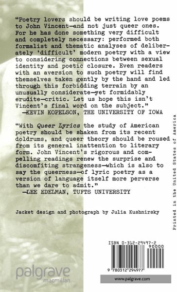 "Poetry lovers should be writing love poems to John Vincent - and not just queer ones. For he has done something very difficult and completely necessary: performed both formalist and thematic analyses of deliberately 'difficult' modern poetry with a view to considering connections between sexual identity and poetic closure. Even readers with an aversion to such poetry will find themselves taken gently by the hand and led through this forbidding terrain by an unusually considerate - yet formidably erudite - critic. Let us hope this isn't Vincent's final word on the subject." - Kevin Kopelson, The University of Iowa