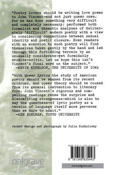 "Poetry lovers should be writing love poems to John Vincent - and not just queer ones. For he has done something very difficult and completely necessary: performed both formalist and thematic analyses of deliberately 'difficult' modern poetry with a view to considering connections between sexual identity and poetic closure. Even readers with an aversion to such poetry will find themselves taken gently by the hand and led through this forbidding terrain by an unusually considerate - yet formidably erudite - critic. Let us hope this isn't Vincent's final word on the subject." - Kevin Kopelson, The University of Iowa
