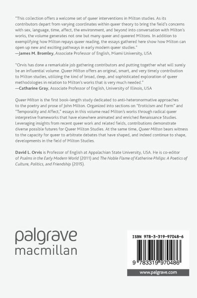 Queer Milton is the first book-length study dedicated to anti-heteronormative approaches to the poetry and prose of John Milton. Organized into sections on "Eroticism and Form" and "Temporality and Affect," essays in this volume read Milton's works through radical queer interpretive frameworks that have elsewhere animated and enriched Renaissance Studies. Leveraging insights from recent queer work and related fields, contributions demonstrate diverse possible futures for Queer Milton Studies. At the same time, Queer Milton bears witness to the capacity for queer to arbitrate debates that have shaped, and indeed continue to shape, developments in the field of Milton Studies.