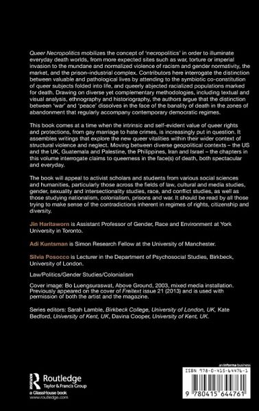 Queer Necropolitics mobilises the concept of 'necropolitics' in order to illuminate everyday death worlds, from more expected sites such as war, torture or imperial invasion to the mundane and normalised violence of racism and gender normativity, the market, and the prison-industrial complex. Contributors here interrogate the distinction between valuable and pathological lives by attending to the symbiotic co-constitution of queer subjects foldedinto life, and queerly abjected racialised populations marked for death. Drawing on diverse yet complementary methodologies, including textual and visual analysis, ethnography and historiography, the authors argue that the distinction between 'war' and 'peace' dissolves in the face of the banality of death in the zones of abandonment that regularly accompany contemporary democratic regimes.