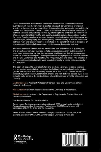 Queer Necropolitics mobilises the concept of 'necropolitics' in order to illuminate everyday death worlds, from more expected sites such as war, torture or imperial invasion to the mundane and normalised violence of racism and gender normativity, the market, and the prison-industrial complex. Contributors here interrogate the distinction between valuable and pathological lives by attending to the symbiotic co-constitution of queer subjects foldedinto life, and queerly abjected racialised populations marked for death. Drawing on diverse yet complementary methodologies, including textual and visual analysis, ethnography and historiography, the authors argue that the distinction between 'war' and 'peace' dissolves in the face of the banality of death in the zones of abandonment that regularly accompany contemporary democratic regimes.