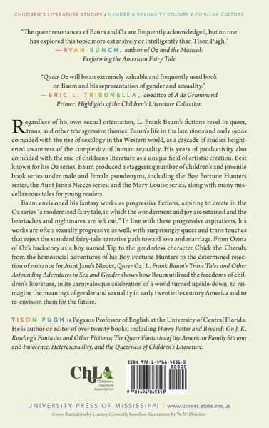 Regardless of his own sexual orientation, L. Frank Baum's fictions revel in queer, trans, and other transgressive themes. Baum's life in the late 1800s and early 1900s coincided with the rise of sexology in the Western world, as a cascade of studies heightened awareness of the complexity of human sexuality. His years of productivity also coincided with the rise of children's literature as a unique field of artistic creation. Best known for his Oz series, Baum produced a staggering number of children's and juvenile book series under male and female pseudonyms, including the Boy Fortune Hunters series, the Aunt Jane's Nieces series, and the Mary Louise series, along with many miscellaneous tales for young readers. Baum envisioned his fantasy works as progressive fictions, aspiring to create in the Oz series "a modernized fairy tale, in which the wonderment and joy are retained and the heartaches and nightmares are left out." In line with these progressive aspirations, his works are often sexually progressive as well, with surprisingly queer and trans touches that reject the standard fairy-tale narrative path toward love and marriage. From Ozma of Oz's backstory as a boy named Tip to the genderless character Chick the Cherub, from the homosocial adventures of his Boy Fortune Hunters to the determined rejection of romance for Aunt Jane's Nieces, Queer Oz: L. Frank Baum's Trans Tales and Other Astounding Adventures in Sex and Gender shows how Baum exploited the freedoms of children's literature, in its carnivalesque celebration of a world turned upside-down, to reimagine the meanings of gender and sexuality in early twentieth-century America and to re-envision them for the future.
