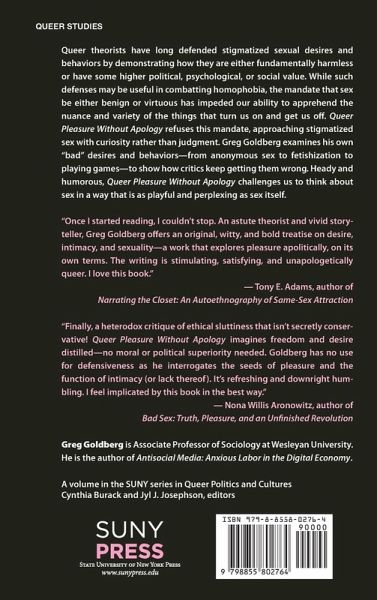 Approaches stigmatized sex with candor and curiosity, interweaving experience and analysis to better appreciate the intricacies and intrigue of queer desires and pleasures. Queer theorists have long defended stigmatized sexual desires and behaviors by demonstrating how they are either fundamentally harmless or have some higher political, psychological, or social value. While such defenses may be useful in combatting homophobia, the mandate that sex be either benign or virtuous has impeded our ability to apprehend the nuance and variety of the things that turn us on and get us off. Queer Pleasure Without Apology refuses this mandate, approaching stigmatized sex with curiosity rather than judgment. Greg Goldberg examines his own "bad" desires and behaviors-from anonymous sex to fetishization to playing games-to show how critics keep getting them wrong. Heady and humorous, Queer Pleasure Without Apology challenges us to think about sex in a way that is as playful and perplexing as sex itself.