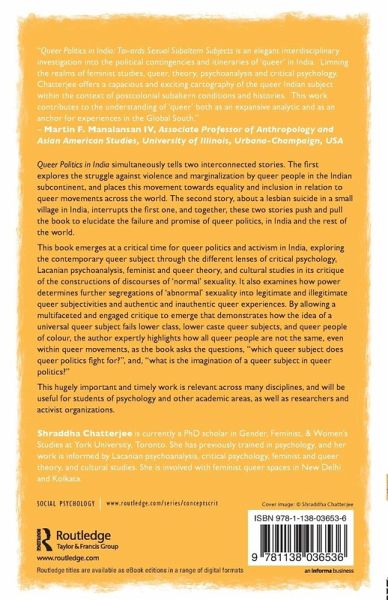 This book emerges at a critical time for queer politics and activism in India, exploring the contemporary queer subject through the different lenses of critical psychology, Lacanian psychoanalysis, feminist and queer theory, and cultural studies in its critique of the constructions of discourses of 'normal' sexuality. It also examines how power determines further segregations of 'abnormal' sexuality into legitimate and illegitimate queer subjectivities and authentic and inauthentic queer experiences. By allowing a multifaceted and engaged critique to emerge that demonstrates how the idea of a universal queer subject fails lower class, lower caste queer subjects, and queer people of colour, the author expertly highlights how all queer people are not the same, even within queer movements, as the book asks the questions, "which queer subject does queer politics fight for?", and, "what is the imagination of a queer subject in queer politics?"
