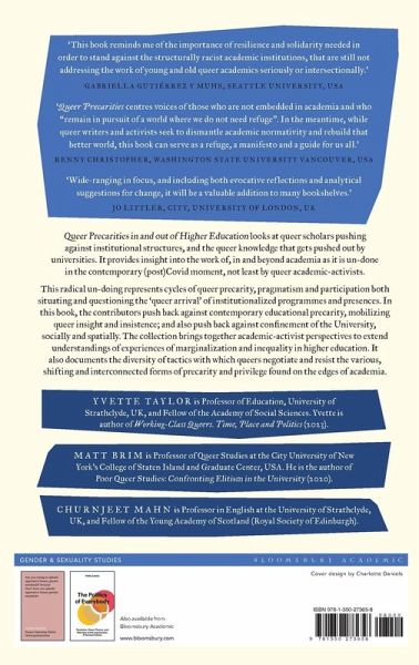 Queer Precarities in and out of Higher Education looks at queer scholars pushing against institutional structures, and the queer knowledge that gets pushed out by universities. It provides insight into the work of, in and beyond academia as it is un-done in the contemporary (post)Covid moment, not least by queer academic-activists. This radical un-doing represents cycles of queer precarity, pragmatism and participation both situating and questioning the 'queer arrival' of institutionalized programmes and presences (e.g. queer and gender studies degrees, prominent and public feminist academics). In this book, the contributors push back against contemporary educational precarity, mobilizing queer insight and insistence; and push back against confinement of the University, socially and spatially. The collection brings together academic-activist perspectives to extend understandings of experiences of marginalization and inequality in higher education. It also documents the diversity of tactics with which queers negotiate and resist the various, shifting and interconnected forms of precarity and privilege found on the edges of academia. Contributors consider these issues from inside/outside academia and across career course, challenging the 'queer arrival' as emanating outward from the university to the community, from the academic to the activist, or from a state of privilege to a place of precarity.