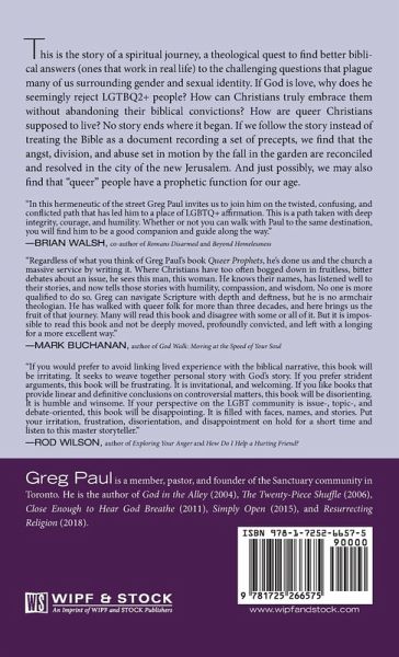 This is the story of a spiritual journey, a theological quest to find better biblical answers (ones that work in real life) to the challenging questions that plague many of us surrounding gender and sexual identity. If God is love, why does he seemingly reject LGTBQ2+ people? How can Christians truly embrace them without abandoning their biblical convictions? How are queer Christians supposed to live? No story ends where it began. If we follow the story instead of treating the Bible as a document recording a set of precepts, we find that the angst, division, and abuse set in motion by the fall in the garden are reconciled and resolved in the city of the new Jerusalem. And just possibly, we may also find that "queer" people have a prophetic function for our age.