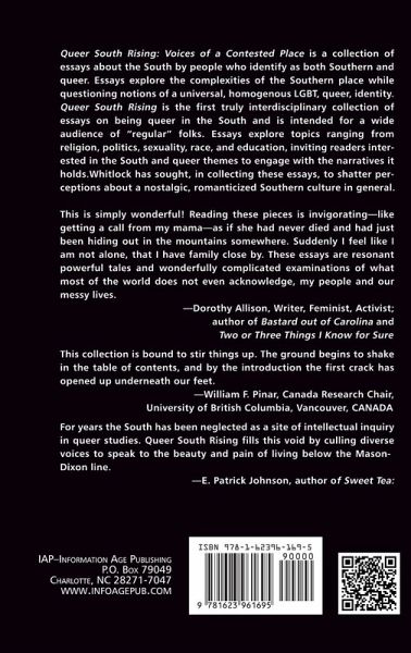 Queer South Rising: Voices of a Contested Place is a collection of essays about the South by people who identify as both Southern and queer. The collection's name hints at the provocative nature of its contents: placing Queer and South side-by-side challenges readers to think about each word differently. The idea that a queer South might rise undermines the Battle Cry of "The South's Gonna rise Again!" embedded in the collective memory of a conservative South. This rising does not refer to a kind of Enlightenment transcendence where the region achieves some sort of distinctive prominence. It suggests instead ruptures, like furrows in a plowed field where seeds are sown. The rising Whitlock envisions is akin to breaking and turning over meanings of Southern place. The title further serves to remind readers of the complexities of the place as it calls into question notions of a universal, homogenous LGBT, queer, identity. Queer South Rising is the first truly interdisciplinary collection of essays on the South and queerness that deliberately aims for multiple approaches to the topics. This collection is intended for a wide audience of "regular" folks. Essays explore multiple intersections of Southern place-religion, politics, sexuality, race, education-that transcend regional boundaries. This book counters conventional scholarly texts; it invites all readers interested in the South and queer themes to engage with the narratives it holds-and perhaps question their assumptions. Whitlock has sought, in collecting these essays, to seek out a diverse group of authors-across disciplines, professions, and interests-to shatter perceptions about a nostalgic, romanticized Southern culture in general.