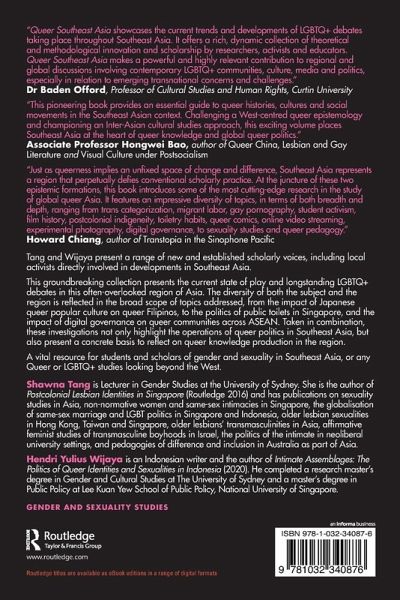 "Queer Southeast Asia showcases the current trends and developments of LGBTQ+ debates taking place throughout Southeast Asia. It offers a rich, dynamic collection of theoretical and methodological innovation and scholarship by researchers, activists and educators. Queer Southeast Asia makes a powerful and highly relevant contribution to regional and global discussions involving contemporary LGBTQ+ communities, culture, media and politics, especially in relation to emerging transnational concerns and challenges."---Dr Baden Offord, Professor of Cultural Studies and Human Rights, Curtin University