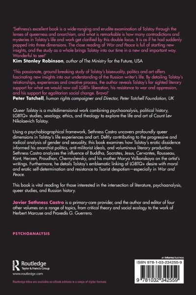 Using a psychobiographical framework, Sethness Castro uncovers profoundly queer dimensions in Tolstoy's life experiences and art. Deftly contributing to the progressive and radical analysis of gender and sexuality, this book examines how Tolstoy's erotic dissidence informed his anarchist politics, anti-militarist ideals, and voluminous literary production. Sethness Castro analyzes the influence of Buddha, Socrates, Jesus, Cervantes, Rousseau, Kant, Herzen, Proudhon, Chernyshevsky, and his mother Marya Volkonskaya on the artist's writings. Furthermore, he details Tolstoy's emblematic linking of LGBTQ+ desire with moral and erotic self-determination and resistance to Tsarist despotism-especially in War and Peace.
