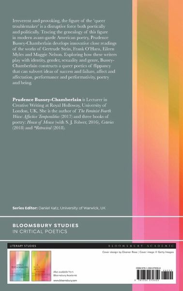 Irreverent and provoking, the figure of the 'queer troublemaker' is a disruptive force both poetically and politically. Tracing the genealogy of this figure in modern avant-garde American poetry, Prudence Bussey-Chamberlain develops innovative close readings of the works of Gertrude Stein, Frank O'Hara, Eileen Myles and Maggie Nelson. Exploring how these writers play with identity, gender, sexuality and genre, Bussey-Chamberlain constructs a queer poetics of flippancy that can subvert ideas of success and failure, affect and affectation, performance and performativity, poetry and being.