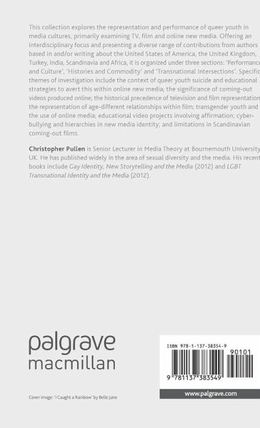 Preface Acknowledgements Contributors Introduction; Christopher Pullen PART I: PERFORMANCE AND CULTURE 1. Stories Like Mine: Coming Out Videos and Queer Identities on YouTube; Bryan Wuest 2. Transgender Youth and YouTube Videos: Self-Representation and Five Identifiable Trans Youth Narratives; Matthew G. O'Neill 3. 'A Safe and Supportive Environment': LGBTQ Youth and Social Media; Stephen Tropiano 4. Media Responses to Queer Youth Suicide: Trauma, Therapeutic Discourse and Co-Presence; Christopher Pullen 5. Sexually Marginalized Youth in the South: Narration Strategies and Discourse Coalitions in Newspaper Coverage of a Southern High School Gay-Straight Alliance Club Controversy; Skyler Lauderdale 6. 'WE'VE GOT BIG NEWS': Creating Media to Empower Queer Youth in Schools; Karyl Kethcum PART II: HISTORIES AND COMMODITY 7. Talking Liberties: Framed Youth , Community Video and Channel 4's Remit in Action; Ieuan Franklin 8. We Need to Talk about Jack! On the Representation of Male Homosexuality in American Teen Soaps; Mareike Jenner 9. Queering TV Conventions: LGBT Teen Narratives on Glee ; RAffi Sarkissian 10. Boy Wizards: Magical and Homosocial Power in Harry Potter and the Goblet of Fire and The Covenant ; Katherine Hughes 11. Androgynous Social Media & Visual Culture; Stephanie Selvick 12. Queer Youth Cyber-bullying and Policing the Self-Brand; Taylor Nygaard 13. Looking at Complicated Desires: Gay Male Youth and Cinematic Representations of Age-Different Relationships; Kylo-Patrick R. Hart PART III: TRANSNATIONAL INTERSECTIONS 14. Straight Eye for the Queer Guy: Gay Youth in Contemporary Scandinavian Film; Anders Lysne 15. 'Born This Way': Media and Youth Identities in Uganda's Kuchu Community; Melanie Butler and Paul Falzone 16. 'Be Wary of Working Boys': The Cultural Production of Queer Youth in Today's West Africa; Noah Tsika 17. LGBT Student Groups at Universities and their Usage of Social Media as a Public Sphere: A Case Analysis - luBUnya ; ?dilEngideniz ?ahan 18. Parties, Advocacy and Activism: Interrogating Community and Class in Digital Queer India; Rohit K. Dasgupta 19. The It Gets Better Project: A Study In (and of) Whiteness - in LGBT Youth and Media Cultures; Michael Johnson Jr.
