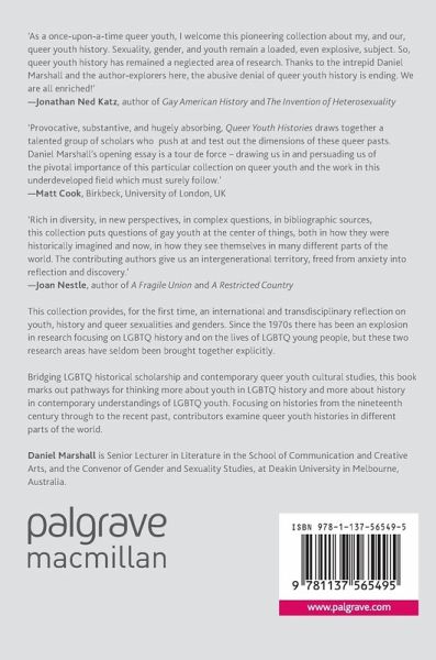 Chapter One: Queer Youth Histories: An Introduction; Daniel Marshall.- Chapter Two:Toward Psychosexual Development: Preliminaries to Queer Youth Prehistory; Diederik F. Janssen.- Chapter Three: Perverse Plasticity in G. Stanley Hall's Modern American Adolescence; Don Romesburg.- Chapter Four: Same-sex Desire and Young New Zealanders before 1950; Chris Brickell.- Chapter Five:"'We Will Never Betray You, Brothers and Sisters:' Queer Youth and the Intellectual History of Gay Liberation across the Anglo-American World"; Scott de Groot.- Chapter Six: "Cherishing all the Children of the Nation Equally" - Gay Youth Organisation and Activism in Ireland; Patrick James McDonagh and Páraic Kerrigan.- Chapter Seven: The "New" Trans Child: Pioneering Families and Documentary Television; Jessica Ann Vooris.- Chapter Eight: Between Norms and Differences : The Online Histories of Quebec's Queer Youth; Roberto Ortiz Nunez and Dominique Meunier.- Chapter Nine: The Print Culture of 'Bombay Dost':The "Recent Past" of Queer Youth in Postcolonial India; Pawan Singh.- Chapter Ten: Tuning into yourself: queer coming of age and music; Marion Wasserbauer.- Chapter Eleven: Escaping to a Digital Congregation: LGBTQIA Mormon Youth on Tumblr and the Rise and Decline of Queerstake; David Eichert.- Chapter Twelve: Historical and contemporary silences: the experiences of queer Muslim youth; Shanon Shah Mohd Sidik.- Chapter Thirteen: Schoolgirl lesbians in Hong Kong: (A)historicity, temporality, and survival; Sonia Wong.- Chapter Fourteen: Growing up needing the past: an activist's reflection on the history of LGBT History Month in the UK; Sue Sanders.- Chapter Fifteen: Being a young gay person in the 1970s: reflections on reading Young, Gay and Proud; Karen Charman.- Chapter Sixteen: Mundjulk: One plant, many leaves; Laniyuk Garcon.- Index