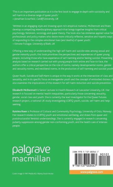 Offering a new way of understanding the high self-harm and suicide rates among sexual and gender minority youth, this book prioritises the perspectives and experiences of queer young people, including those who have experience of self-harming and/or feeling suicidal. Presenting analysis based on research carried out with young people both online and face-to-face, the authors offer a critical perspective on the role of norms, namely developmental norms, gender and sexuality norms, and neoliberal norms, in the production of self-harming and suicidal youth.